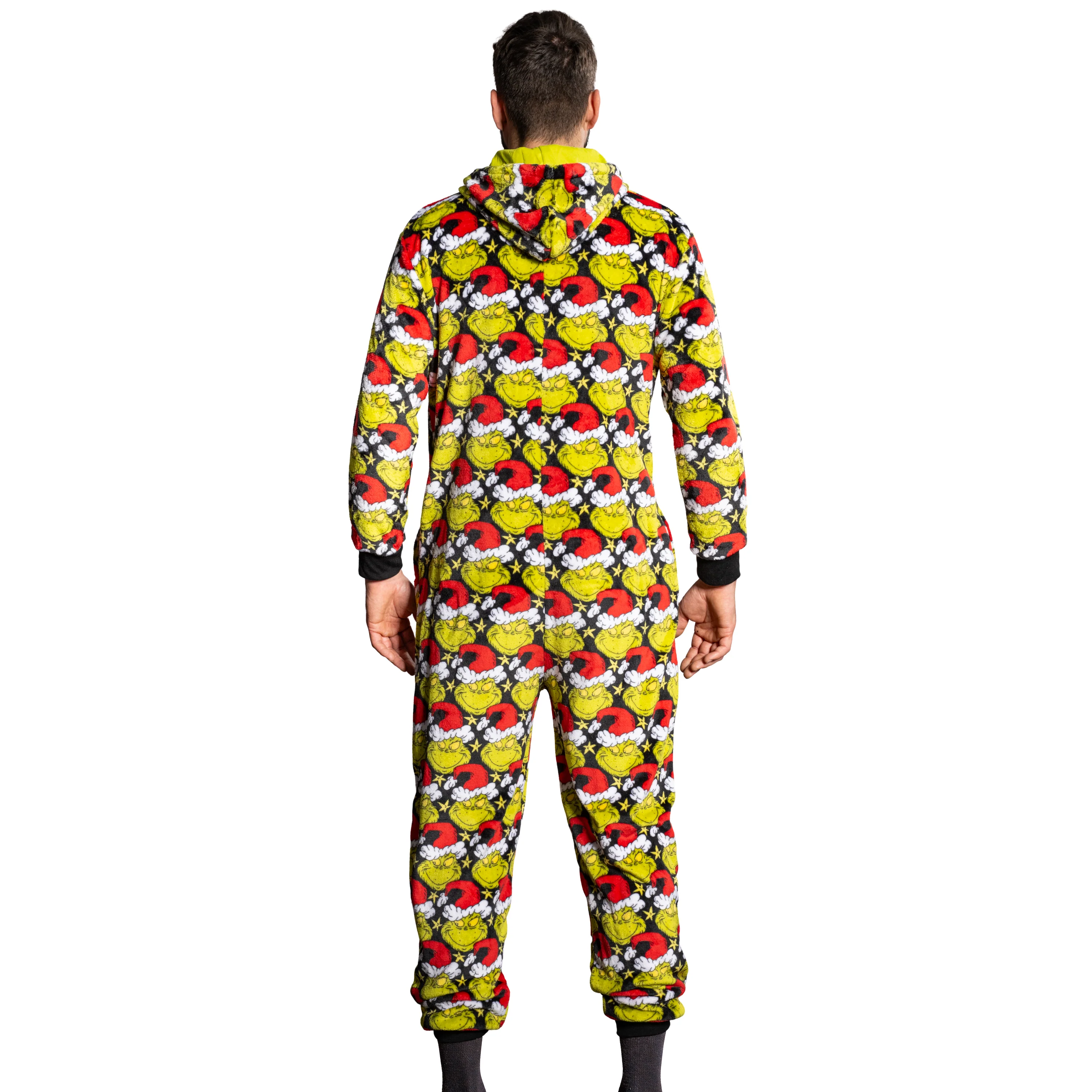 Grinch with Santa Hat Face All Over Pajamas Jumpsuit Christmas Union Suit with Hood and Pockets for Mens and Womens